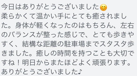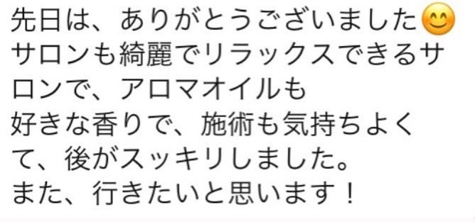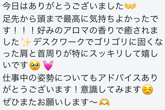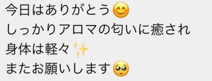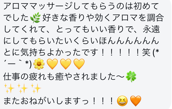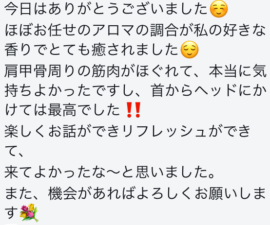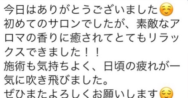 仕事、運動、家事、育児、、、 頑張り方は人それぞれだけど休息はみんなに必要なもの。 頑張るあなたをストレスや疲労から解放しベストなパフォーマンスに導けるよう医療資格保有者の私がリラックスタイムをお届けします。 あなただけの香りに包まれてあなたなりのリラックスタイムをお過ごしください。