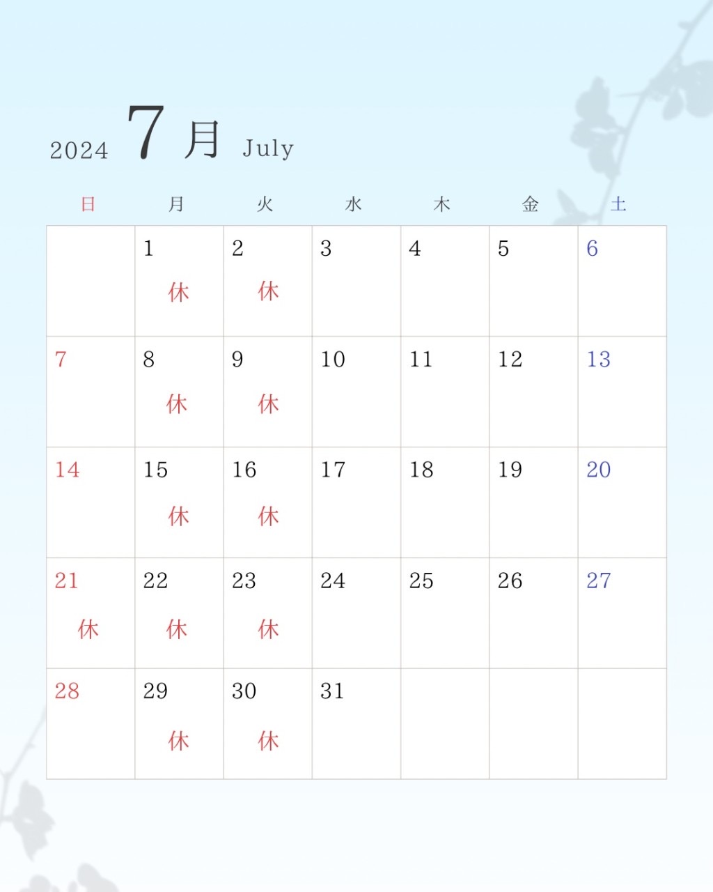 7月の営業日をお知らせします。