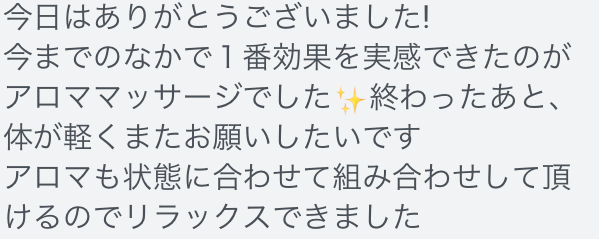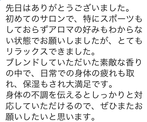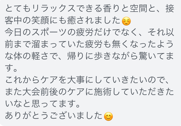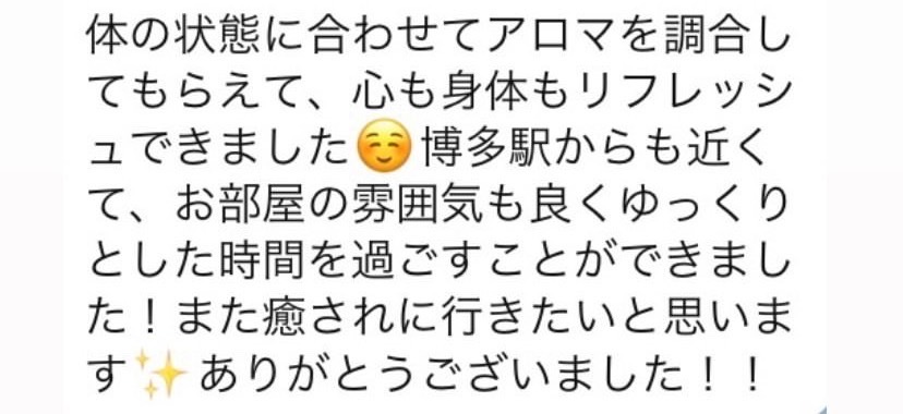 仕事、運動、家事、育児、、、 頑張り方は人それぞれだけど休息はみんなに必要なもの。 頑張るあなたをストレスや疲労から解放しベストなパフォーマンスに導けるよう医療資格保有者の私がリラックスタイムをお届けします。 あなただけの香りに包まれてあなたなりのリラックスタイムをお過ごしください。