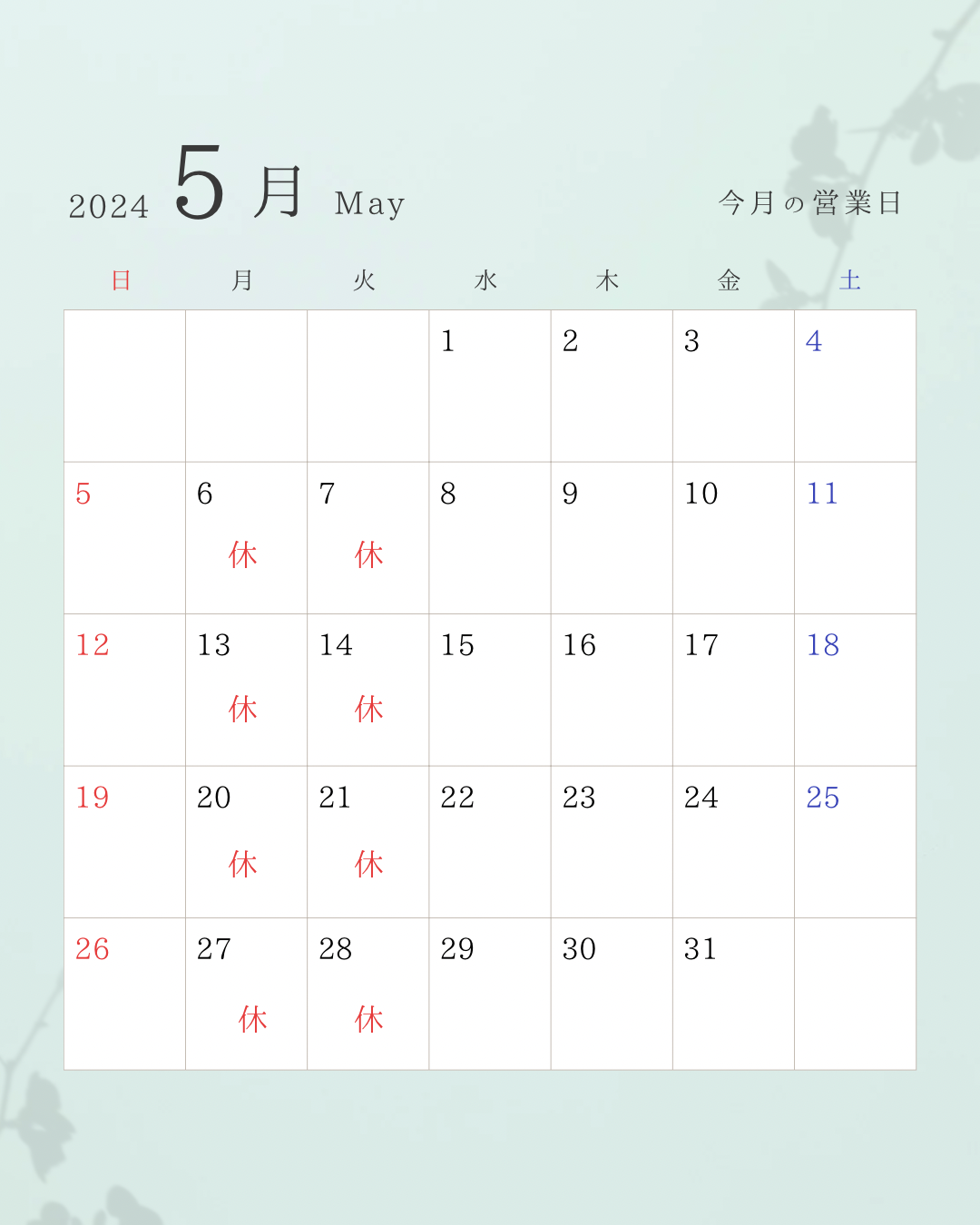 5月の営業予定のお知らせ